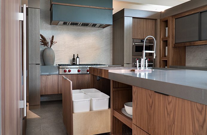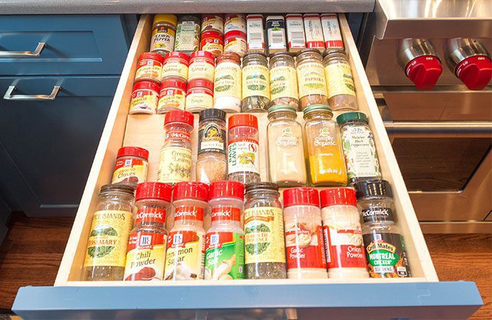 We discuss spice racks, stadium organizers in drawers, optimizers, and lazy Susans. The trash-pull out is practically the number one item clients want. An appliance garage is a personal thing to people. If they will use them enough, then it is worth it. You’re taking up counter depth, so you’re taking away that usable counter space. If you use a Vitamix every day, then it may be worth it. Many of our clients like the cookie sheet dividers either over the ovens or down below.