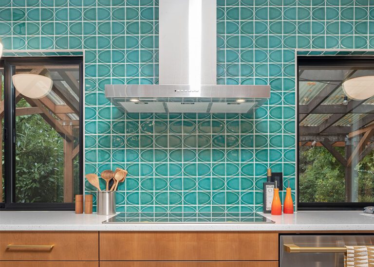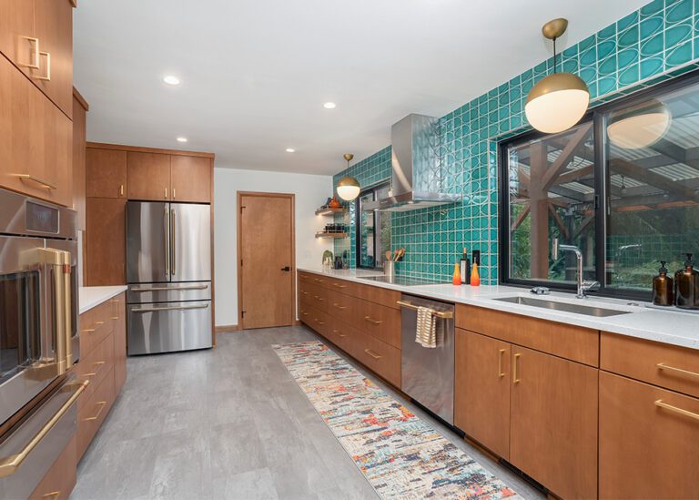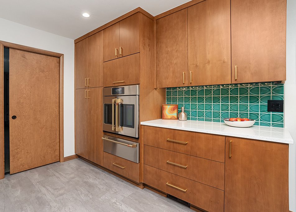 This 1953 Portland home, located near Lewis & Clark College, underwent a kitchen remodel that respects its mid-century modern roots while making better use of the existing space. We reimagined the layout to fill the room more effectively. We incorporated warm wood tones and fun green tile color to honor the home’s original character without being strictly period-correct. The result is a practical and inviting kitchen that blends vintage inspiration with contemporary living needs and provides ample storage for the two scientist homeowners.
