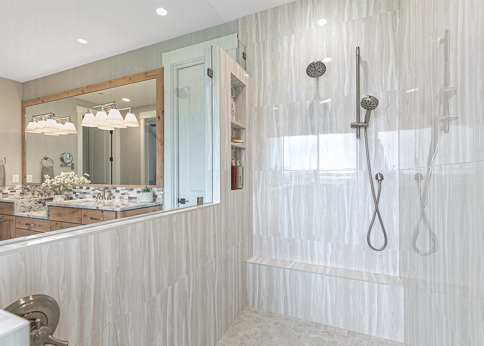- Removed the oversized tub deck in the primary bathroom to make room for a larger walk-in shower with a half wall, oversized shampoo niche, and ledge