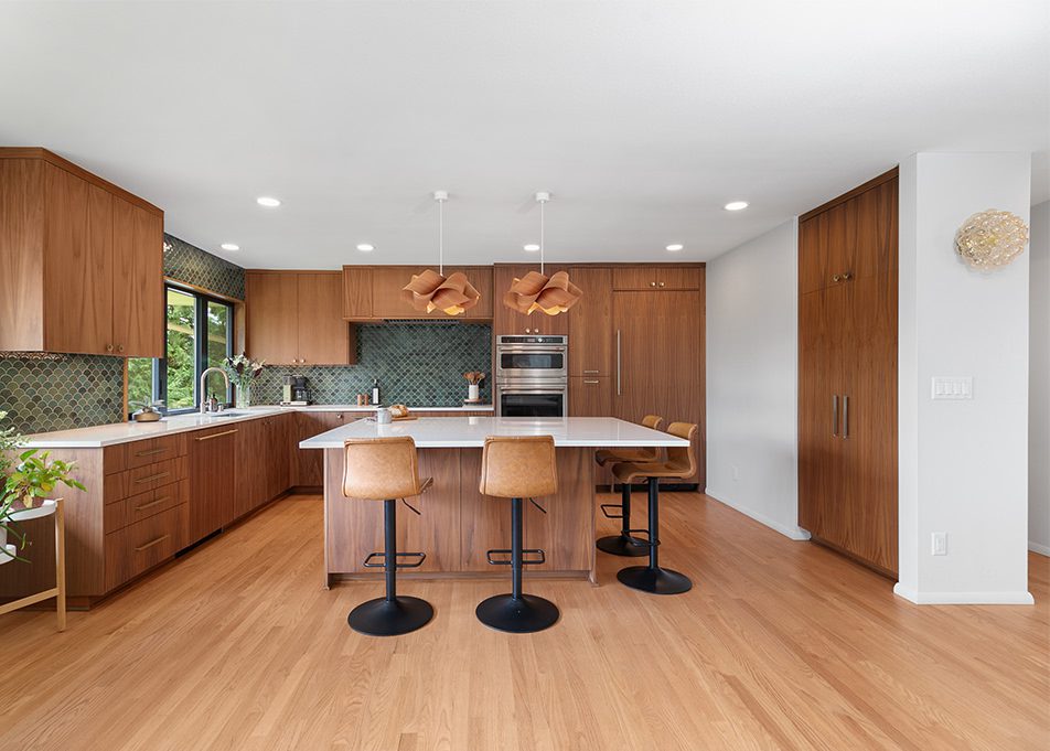 Repeat clients of Mountainwood Homes traded their rural property for a downtown Camas, Washington charmer to enjoy a walkable lifestyle while their children finish high school. They bought an original, 1954 midcentury modern home intending to remodel it as a transitional family space before college. The whole house renovation balances modern living with respect for the original architectural character, blending contemporary finishes and functional upgrades to preserve its midcentury charm.